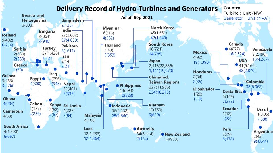 東芝在日本、中國、東南亞乃至非洲及中南美洲共40多個(gè)國家和地區累計交付2300多臺水輪機和1800多臺發(fā)電機,設備容量分別超過(guò)62,000MW和75,000MVA。東芝擁有超過(guò)一個(gè)世紀的豐富經(jīng)驗與傲人業(yè)績(jì)。