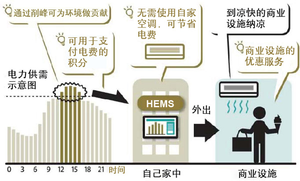 東芝開(kāi)發(fā)的“HEMS”可以掌握電力需求高峰時(shí)期,通過(guò)提前向住戶(hù)提示用電高峰時(shí)商業(yè)設施的優(yōu)惠服務(wù)信息,促使居民外出實(shí)現個(gè)人住宅的節能,同時(shí),還根據居民在高峰時(shí)間的節電量獎勵相應的積分,積分可以用于支付電費。通過(guò)提供多種優(yōu)惠和獎勵,實(shí)現高峰用電分流。