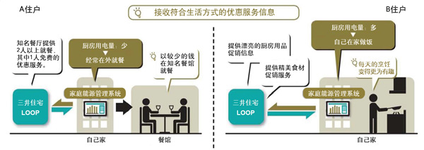 東芝開(kāi)發(fā)的“HEMS”以各居民住戶(hù)的用電信息為基礎,對居民的生活方式進(jìn)行分析。并從 “三井住宅LOOP” 注2合作的餐廳、家電量販店、家務(wù)代理等眾多企業(yè)提供的優(yōu)惠服務(wù)信息中,選擇符合各居民生活方式和潛在需求的服務(wù),并在適當的時(shí)候顯示在HEMS的畫(huà)面上。