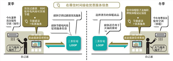 以空調的用電量信息為基礎,分析居民住戶(hù)對氣候冷熱的體感變化和開(kāi)始使用冷暖氣的時(shí)間,在提供環(huán)保節能建議的同時(shí)發(fā)送空調過(guò)濾器清洗優(yōu)惠、應季家電、飾品的優(yōu)惠等服務(wù)信息。由此,居民可以在適當的時(shí)候收到符合自己生活方式的節能建議和優(yōu)惠服務(wù)信息,在促進(jìn)居民采取節能措施的同時(shí),居民也可以享受到符合個(gè)人需求的服務(wù)。