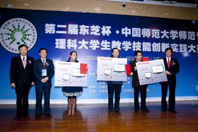 11月14日,15日,由東芝(中國)有限公司、中國教育部國際合作與交流司以及師范教育司共同舉辦的 “第二屆 東芝杯?中國師范大學(xué)師范專(zhuān)業(yè)理科大學(xué)生教學(xué)技能創(chuàng )新實(shí)踐大賽”(以下簡(jiǎn)稱(chēng)大賽)決賽在華東師范大學(xué)舉行。本大賽面向師范大學(xué)學(xué)生,旨在使即將走上工作崗位的師范大學(xué)理科專(zhuān)業(yè)的四年級學(xué)生能夠成為優(yōu)秀的理科教師,從而為中國科學(xué)的自主創(chuàng )新發(fā)揮作用。自去年在京舉辦第一屆以來(lái),該大賽受到了社會(huì )的高度關(guān)注,也成為東芝公司在中國的CSR活動(dòng)的一個(gè)重要部分。
