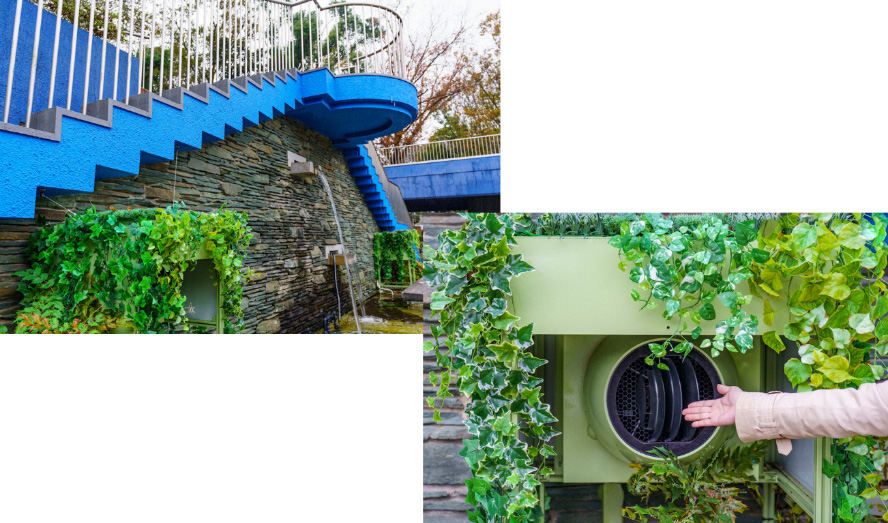 無(wú)需天花板管道,安裝自由度大是“FLEXAIR2”的一大特點(diǎn)。在本次實(shí)驗中,空調系統被安裝在了原本是死角的噴泉周?chē)由?。由于送風(fēng)口的輪盤(pán)可左右自動(dòng)搖擺,將風(fēng)向外輸送到更大的范圍,所以即便在室外也能保持自然舒適。為了將觀(guān)景臺打造成綠洲,大渕先生在安裝設計時(shí)十分注重清涼感、舒適感,目標是帶給游客仿佛置身于大自然中的感覺(jué)。